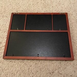 Wood Message Board/Photo Frame Color: Brown/Black Nicely sized message board/photo frame. Top portion has areas for photos with opening at back. Glass panes. Bottom is a magnet board and comes with 5 round wooden magnets. Two metal hangers at back. Measurements (Approximate): 16in W x 13in H x .75in D In very gently used condition. No damage or cracks in glass. Comes from a smoke free, pet free home. Bundle to save or make me an offer!