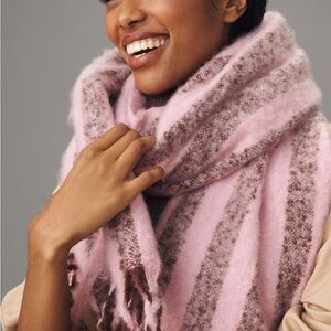 Soft and cozy scarf. Features pink and brown stripes. Perfect for layering.
