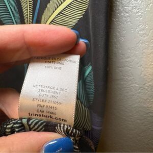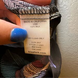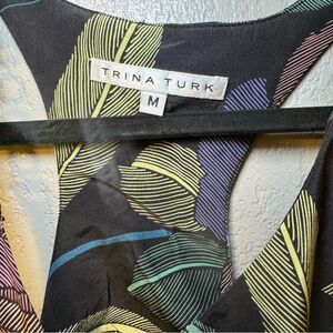 Pretty sleeveless blouse by Trina Turk. Body is black with vibrant pink and blue flowers and green and limes leaves. Tank has some gathering details, an asymmetrical hem and a gold chain detail on the left strap. Blouse is 100% silk.