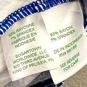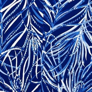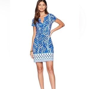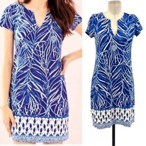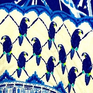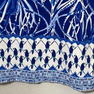EUC Lilly Pulitzer Sophiletta Dress with v-neckline and short sleeves. Gorgeous blue and white print with leaves and parrots. Excellent like-new condition, only worn once. Fabric is 93% Rayon and 7% Spandex.