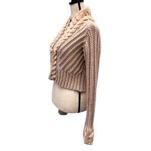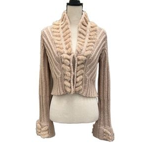 Roberto Cavalli cream 100% cashmere cropped chunky knit sweater with fur trim. There are 3 gold hook closures in front. Fur trim around the neck, down front, and around cuffs. The fur trim is woven through the knit. The V shape angle of the knit is very flattering and emphasizes the waist. The ribbed area around the waist is 4". There are a few minor areas of pilling. See photos. Made in Italy. Gold metal logo with clear crystals under the collar in back. In excellent preowned condition.
