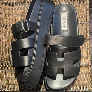 Chic black leather slides by Steve Madden. Ideal for everyday comfort.