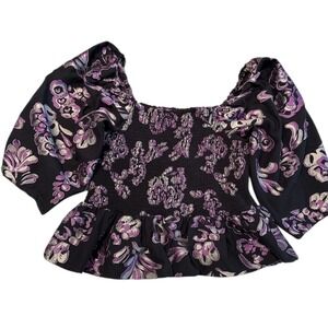 Elevate your wardrobe with this captivating Tanya Taylor peplum top. The smocked bodice hugs your figure beautifully, creating a flattering silhouette that flows into a playful peplum hem. Dramatic puff sleeves with elegant floral detailing add a touch of romantic flair, while the chic square neckline frames your décolletage. This top is perfect for a special dinner date or a stylish brunch with friends.