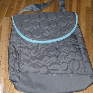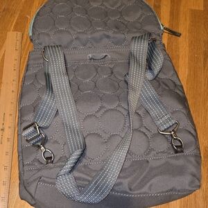 Stylish gray quilted backpack featuring teal accents. Perfect for everyday use.