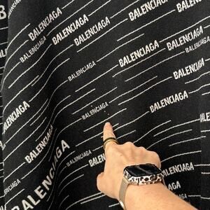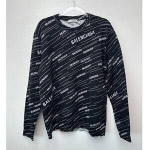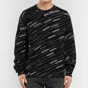 Crewneck sweater in a wool-blend knit with allover diagonal Balenciaga logo intarsia. The front features intentional bleach-effect marks as part of the design. Long sleeves and ribbed collar, cuffs, and hem for a clean finish. Versatile layer that pairs with denim, trousers, or streetwear looks. Identified across retailers as a logo-intarsia wool-blend crewneck style.