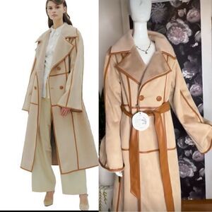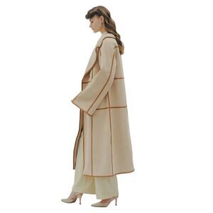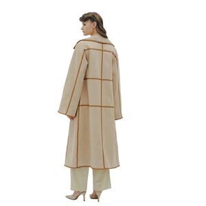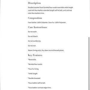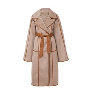 Double-breasted faux suede reversible coat with belt and contrasting faux leather trims.