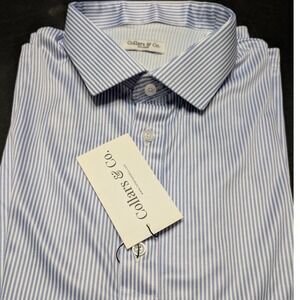 Collars & Co. short sleeve polo shirt features a classic blue and white vertical stripe pattern. Designed with a structured spread collar and a four-button placket, this shirt offers a polished look suitable for both casual and professional settings. The lightweight, breathable fabric ensures comfort throughout the day, while the moisture-wicking properties make it an excellent choice for active wear or warm weather. Finished with a straight hem and short sleeves, this versatile piece pairs well with chinos or shorts.