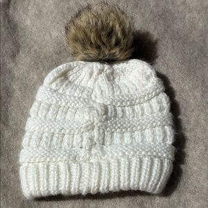 Keep your child warm with the knit beanie. This stylish white hat features a fun pom-pom, perfect for cold weather.