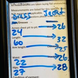 Jacket: Pit to pit: 26", length 26”, arm length 25", waist 26", hips 28"