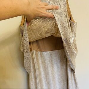 - Dress is maxi length, sleeveless, lined, back zipper closure, with 2 slits on the side