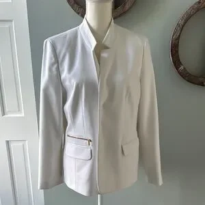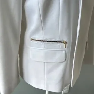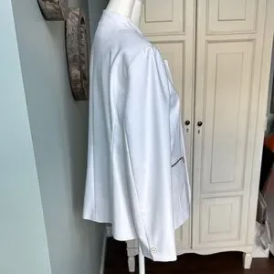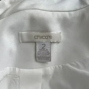 This chic white blazer from Chico's features a tailored fit with structured shoulders and a classic lapel, making it a sophisticated choice for professional settings. Its smooth fabric and modern design ensure a polished look for any occasion. Excellent condition. Pockets are still sewn shut . Freshly cleaned.