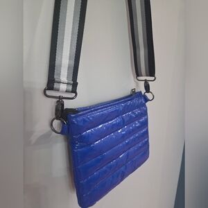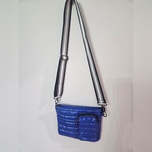 Vibrant shiny blue quilted lightweight puffer design, durable nylon. Very functional and sporty. Has zip front pockets and wide, adjustable, detachable, "guitar style" crossbody strap. 10.5 X 8.5