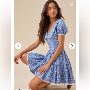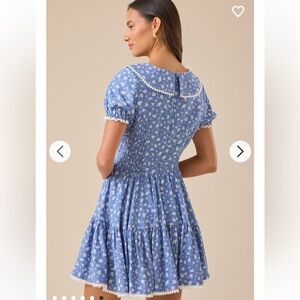 This sweet mini dress features a classic Peter Pan collar, smocked side panels, and delicate lace trim for a vintage-inspired touch. With a dainty floral pattern, it is perfect for everyday wear with a romantic twist.