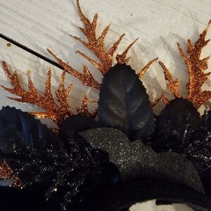Hand decorated Halloween cat ear headband. Black plush cat ears decorated with a black glitter bat, black leaves, black and orange glitter sprigs/fronds. Approx 10" wide x 10-1/2" high. Headband opening stretches to accommodate a variety of head sizes. Only worn once.