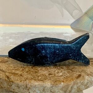 Vintage Zuni Carved Fish Fetish Bead Drilled Black Stone Native American Animal Carving with Turquoise Eyes.