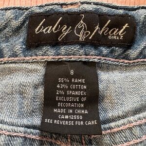 Super cute vintage Baby Phat Girl denim skirt with iconic embroidered cat logo on the front and “baby phat girl” spellout on the back. Features a soft pink ribbed waistband, contrast stitching, and subtle rhinestone embellishments for that classic early 2000s look.