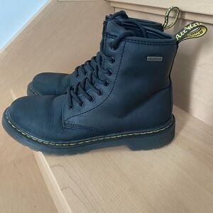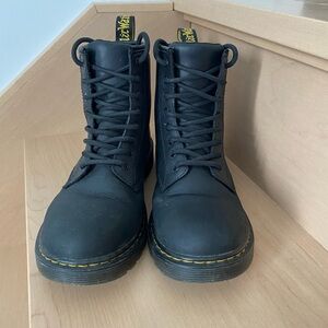 Sleek black boots by Dr. Martens. Features iconic yellow stitching and branded pull tab.