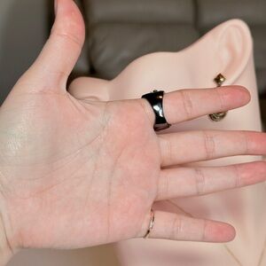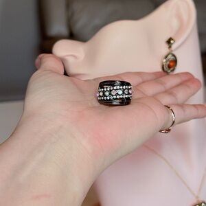 This stunning ring features a sleek black band adorned with shimmering silver crystals. Perfect for adding a touch of elegance to any outfit.