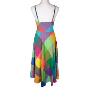 Vibrant linen-blend midi dress showcases a bold multi-color patchwork CheckeredGingham harlequin print in a rainbow of shades. Crafted with a square neckline and delicate spaghetti straps, this piece features a flattering fit-and-flare silhouette that flows into a midi-length hem. The breathable fabric is fully lined with soft cotton for comfort, making it an ideal choice for summer garden parties or vacation wear. A discreet side zipper closure ensures a seamless look.