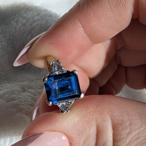 Center stone presents as sapphire-style blue (stone type not professionally tested). Accent stones are clear and bright.
