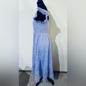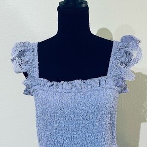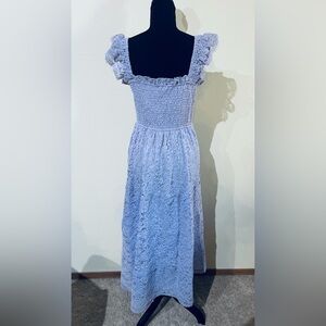 Elegant lavender lace maxi dress. Features ruffled sleeves and smocked bodice. Perfect for special occasions. Photographs as blue but is purple/lilac.