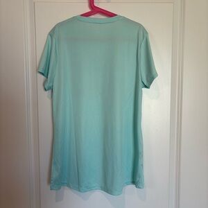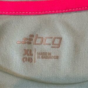 Never worn. Girls short sleeve tee in an aqua blue featuring a graphic design of pink flamingos. Lightweight. Perfect for workouts or casual wear. Girls size XL (16) by bcg.