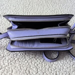 Small lavender crossbody bag. Perfect for any occasion, it combines fashion and functionality with two zippered pockets. One pocket with a built in wallet designed with card slots and coin pouch, and the other fully open.