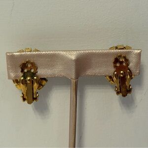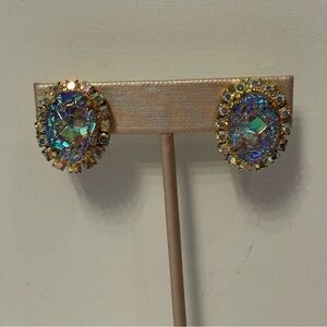 Vintage women’s jewelry clip earrings aurora borealis AB crystal gold tone setting round, prong set and raised oval ice center