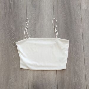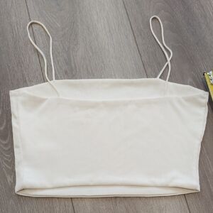 Chic white camisole with spaghetti straps. Ideal for layering or wearing alone. Soft and comfortable fabric. Straps have a slight grey stain of sort. Barely noticed but wanted buyer to be aware. Medium or US size 6