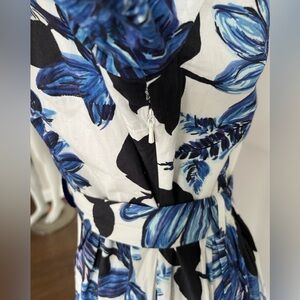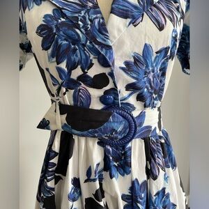 This structured yet feminine silhouette features a collared neckline, a fit-and-flare skirt, a floral or botanical motif in shades of blue, black, and white, two button front closure with hidden side zip, belt with snap closure, and two front pockets.