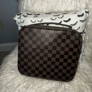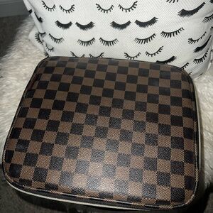Stylish checkered jewelry or makeup organizer box. Features a spacious interior with compartments. Perfect for travel or home use.