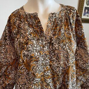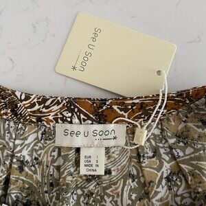 Anthropologie See U Soon Bohemian 3/4 Slv Boat Neck w Split V Placard 100% Cotton Floral Print Parisian Style Midi Dress in Cinnamon Blk Wht NWT