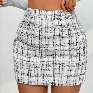 Elevate your style with this chic black and white tweed skirt. Perfect for any occasion, this skirt offers a sophisticated look with its classic design.