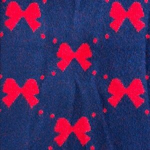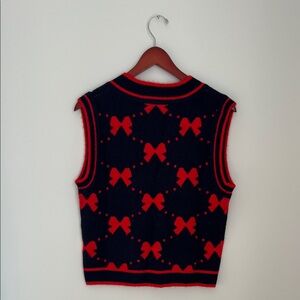 Chic navy sweater vest with red bow patterns. Perfect for layering.