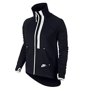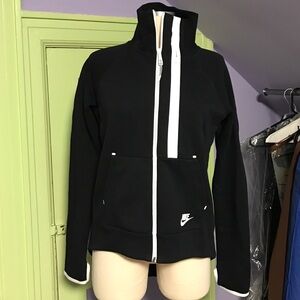 Stylish black hoodie with white accents, high low feature is so flattering. Features front pockets and zip closure. Nike logo on the front. Good preloved condition.