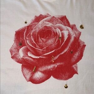 Stylish white t-shirt featuring a bold red rose print. With gold charms that dangle on the shirt inside the rose. Perfect for casual wear.