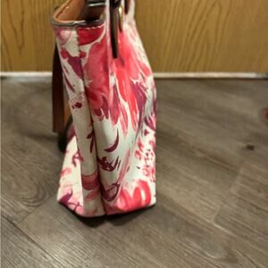 Elegant shoulder bag with bold floral pattern. Features pink and red hues. Ideal for any occasion.