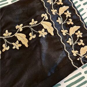 • Luxe black base with detailed gold threadwork