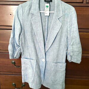 NWT Karen Kane Ruched Sleeve Linen blazer, blue, size XS.This lightweight 100% linen blazer is perfect for spring, summer, or layering for a polished business casual look. Features three-quarter ruched sleeves, notch lapel, single front button closure, and front patch pockets. Unlined for breathable comfort.