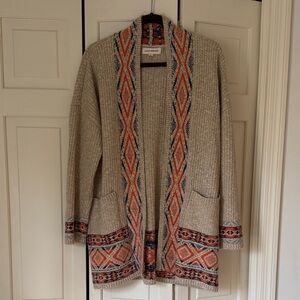 Stylish open front cardigan with geometric patterns. Features a blend of tan and orange colors. 2 pockets.