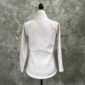 The Athleta Cozy Karma sweatshirt in heather cream is a comfortable and stylish fit. It will keep you warm but ventilated with the open zipper neck detail and open petal front. Zipper pockets for performance and a tailored fit. In excellent pre-owned condition, no flaws.