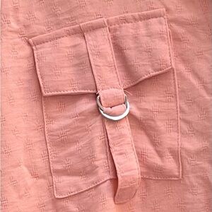 Elevate your wardrobe with this stylish textured peach pink orange pullover women’s top. It features a classic design with two front pockets and split 3/4 length sleeves. The gathered elastic waist gives a sleek neat chic look. Women's Size Large
