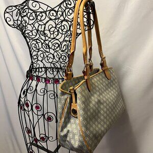 A beautifully structured Dooney & Bourke Signature Satchel featuring the classic DB monogram in grey and white with natural/cream leather trim. This style blends everyday practicality with timeless Dooney craftsmanship, offering multiple pockets, adjustable straps, and a clean, barely‑used interior. Includes original dust bag-missing drawstring.
