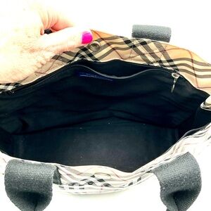 Stylish Burberry Nova Check Tote with Nylon fabric and leather handles. Sides have snap to expanded. Interior has large zip pocket and slip pockets. Comes with COA.