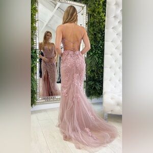 I am wearing the Large in the pictures and I am a true size 10. The Large has a slight tear on the under side of the slit, see the video for a close-up of that and the video shows the lace appliqué. Dresses were store samples so have slight wear.