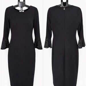 Chic black dress with elegant lace cuffs. Perfect for formal events.