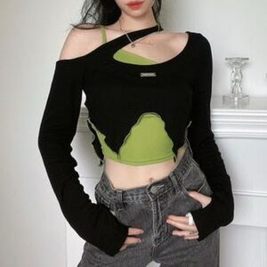 Mock Two Piece Asymmetric Cut-Out Long Sleeve Crop Top