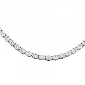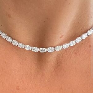 Add timeless elegance to your jewelry collection with this stunning 15” choker-style oval white zircon tennis necklace. Each brilliant oval stone measures approximately 0.40 carats totaling 28ct.tw and is securely set in a classic four-prong setting, allowing incredible light reflection and exceptional sparkle with every movement.