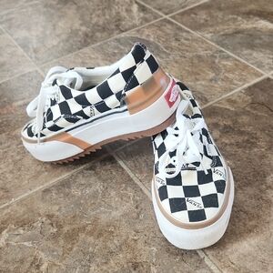 Classic Vans with a bold checkerboard pattern Features black and white design with tan accents. worn only once!