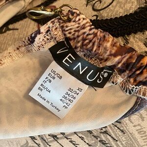 Gorgeous Venus maxi dress in an extra small size, made in Turkey. This stunning dress features a bold and captivating animal print with a mix of textures and colors. The shoulders are adorned with chic gold chain straps that add a touch of glamour. A comfortable elastic waist creates a flattering silhouette. The fabric is incredibly soft and stretchy, made from 95% polyester and 5% elastane, ensuring a perfect and comfortable fit. Perfect for a night out or a stylish day event!